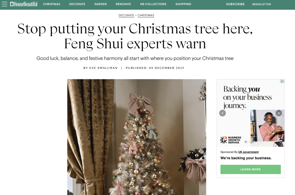 Stop putting your Christmas tree here, Feng Shui experts warn I am delighted to share that I was recently featured in a House Beautiful UK article offering advice on how to use Feng Shui principles for Christmas tree placement. The piece, titled “Stop Putting Your Christmas Tree Here, Feng Shui Experts Warn,” was a wonderful […]