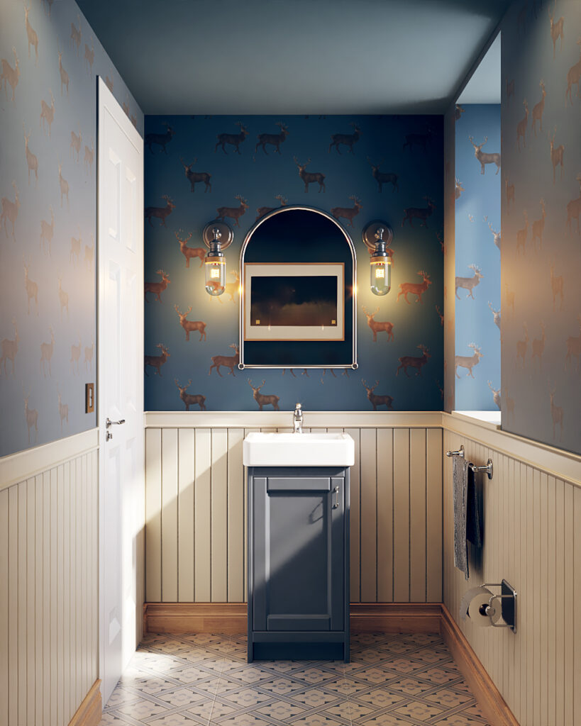 In another cloakroom, we used a pattern wallpaper, patterned tiles and panelling; we opted for panelling as this cloakroom is located in a grade listed building and has to match the timeless classic elegance of the rest of this home; a tongue-and groove wall panelling idea visually frames this stylish cloakroom. The choice for a stag pattern wallpaper was made to create a cohesive design language throughout the house; our clients also own a few pieces of artwork featuring deers and stags.