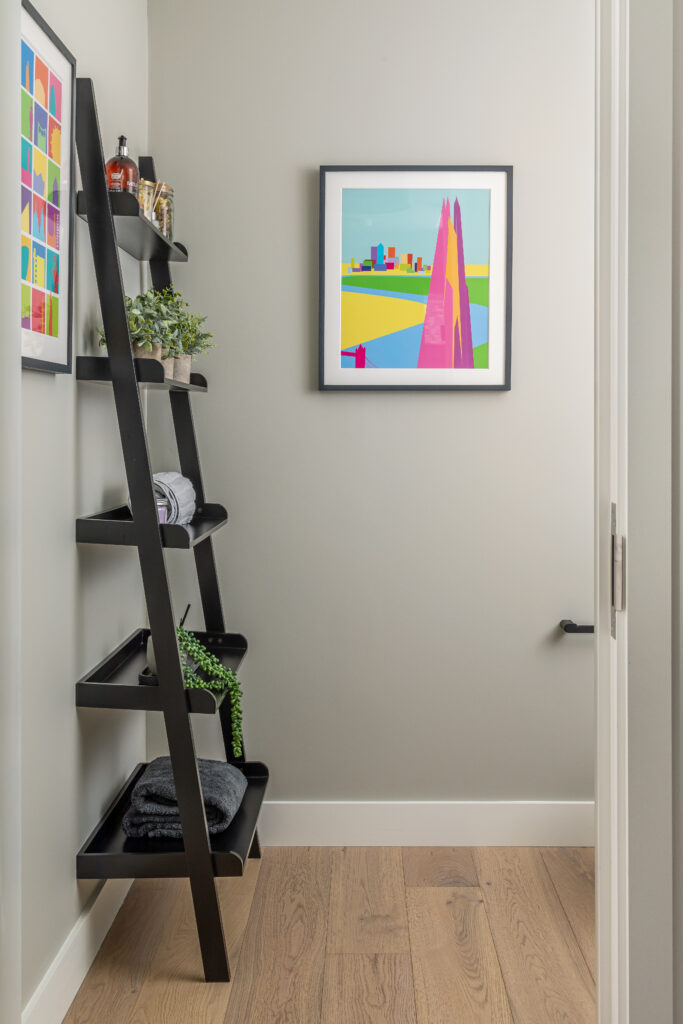 If you’re not a fan of wallpapers, you can chose a slightly stronger wall colour and introduce a colour in artwork; if you have more ample space like in this villa in Eddington in West Cambridge, you can introduce a shelving; remember to fold your towels and add a few plants to create interest. Remember that your cloakroom is a perfect room to display some of your favourite artwork or photos that add interest and reflect your personality