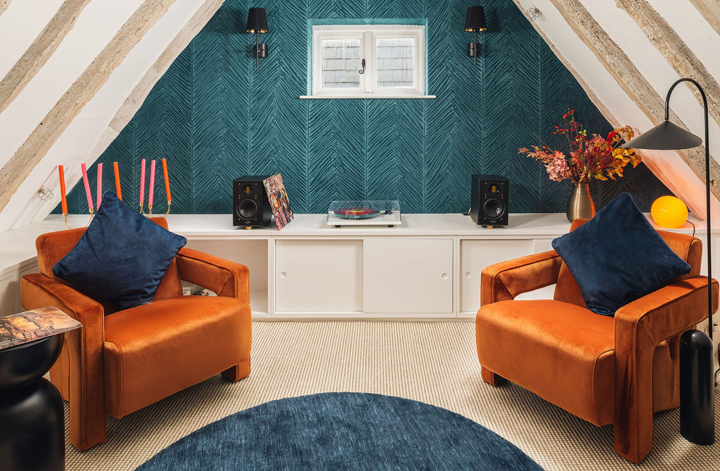 The clients played a pivotal role in setting the direction for this design. They wanted to turn the mezzanine into a music room, which proposed a challenge considering it’s an open plan. It’s hard to believe this space used to work mainly as storage for books, vinyl records and artwork, a it is now a perfectly curated music lounge, where our clients enjoy listening to their beautiful collection of music. To help with the noise we picked a wall covering with acoustic properties from Arte Walls. This wall covering has a beautiful relief with a chenille fabric finish that gives it a three-dimensional effect.