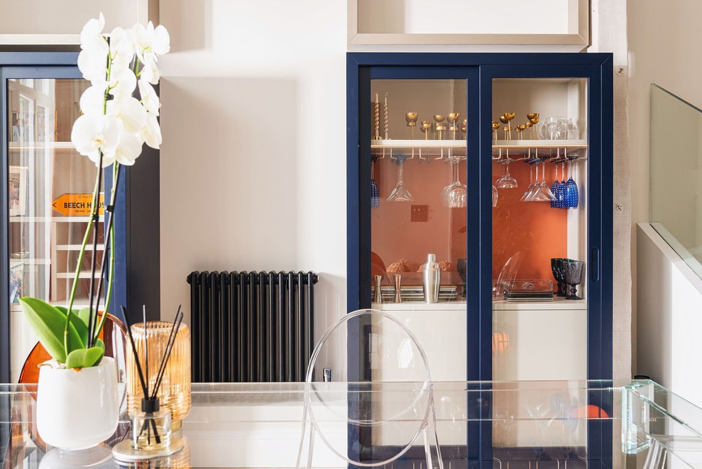 The dining area cabinets are one of my favourite pieces – they have stunning colours inside, a mix of Shale and Montana Agate from Benjamin Moore that tie in with the colour scheme and have a perfect mix of open and closed storage- all of it hidden behind the sliding doors that are a great space saver, ideal for the dining area. Watch the video of the cabinet internals on our Youtube channel.