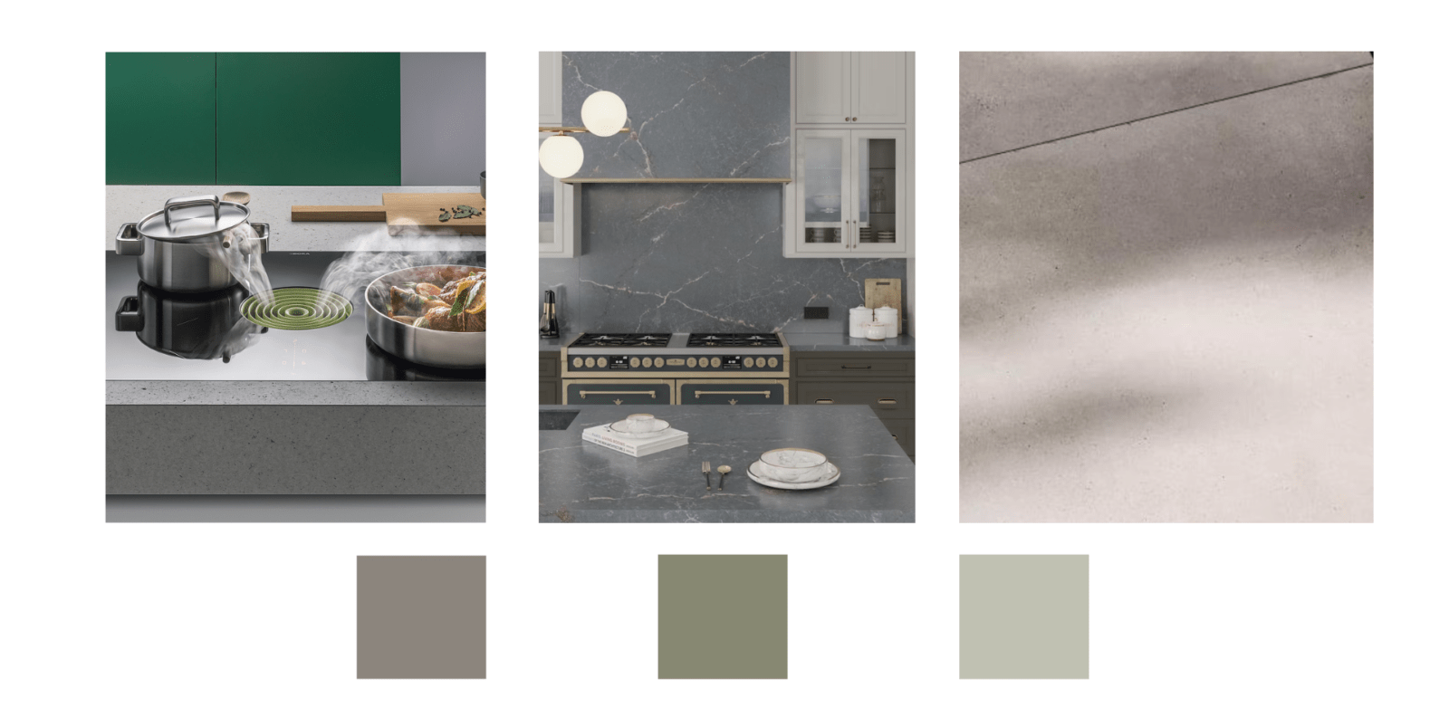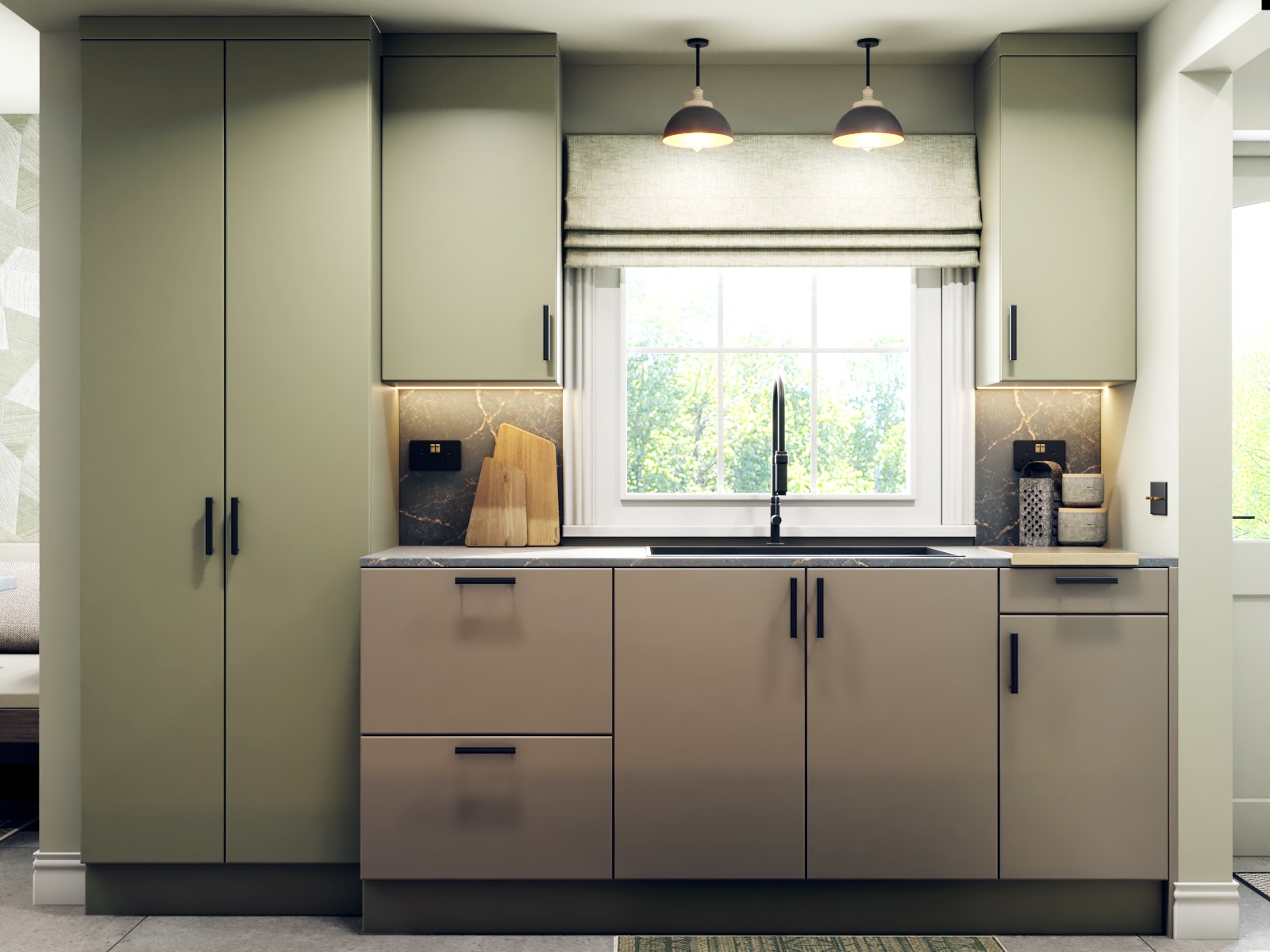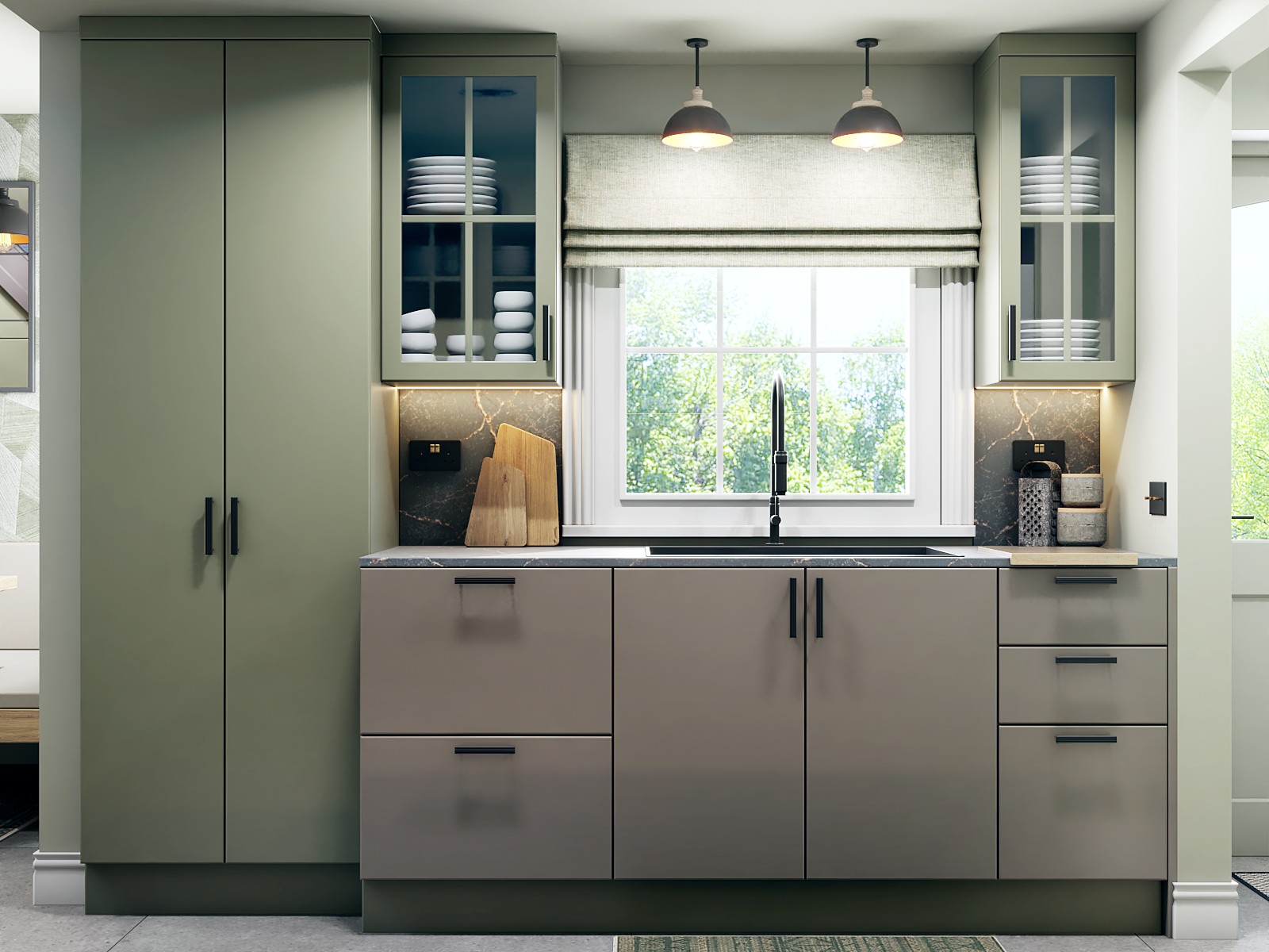 Because we decided to go fully bespoke, we could choose any colour for the units. Since there’s a strong green colour scheme throughout the entire property, we wanted to break it a bit with a warmer, grayish taupe, that’s why we picked Eagle Rock hue from our favourite paint manufacturer, Benjamin Moore, for the base units.  We paired it with the colour of wet, verdant earth, Rolling Hills. This hue features a mix of green, brown and gray tones and mixes very well with the other hues.